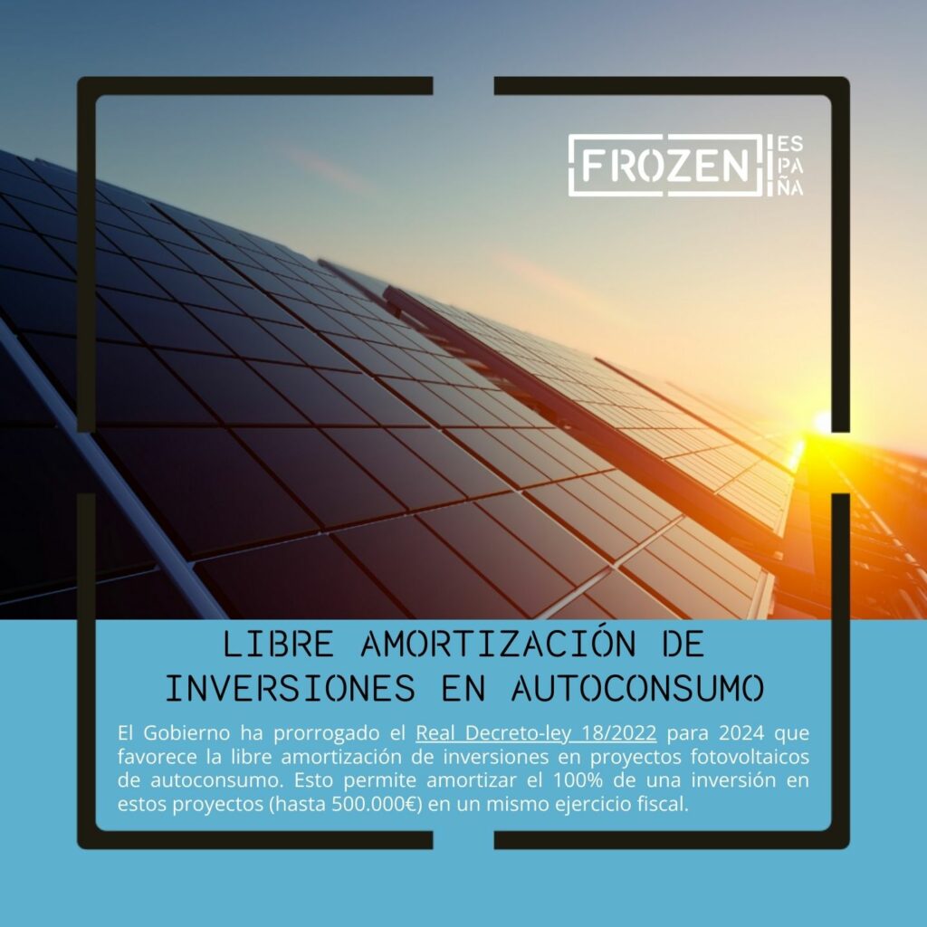 El Gobierno ha prorrogado el Real Decreto-ley 18/2022 para 2024 que favorece la libre amortización de inversiones en proyectos fotovoltaicos de autoconsumo. Esto permite amortizar el 100% de una inversión en estos proyectos (hasta 500.000€) en un mismo ejercicio fiscal. La prórroga de esta medida supone un escudo fiscal, el cual reporta a las empresas […]